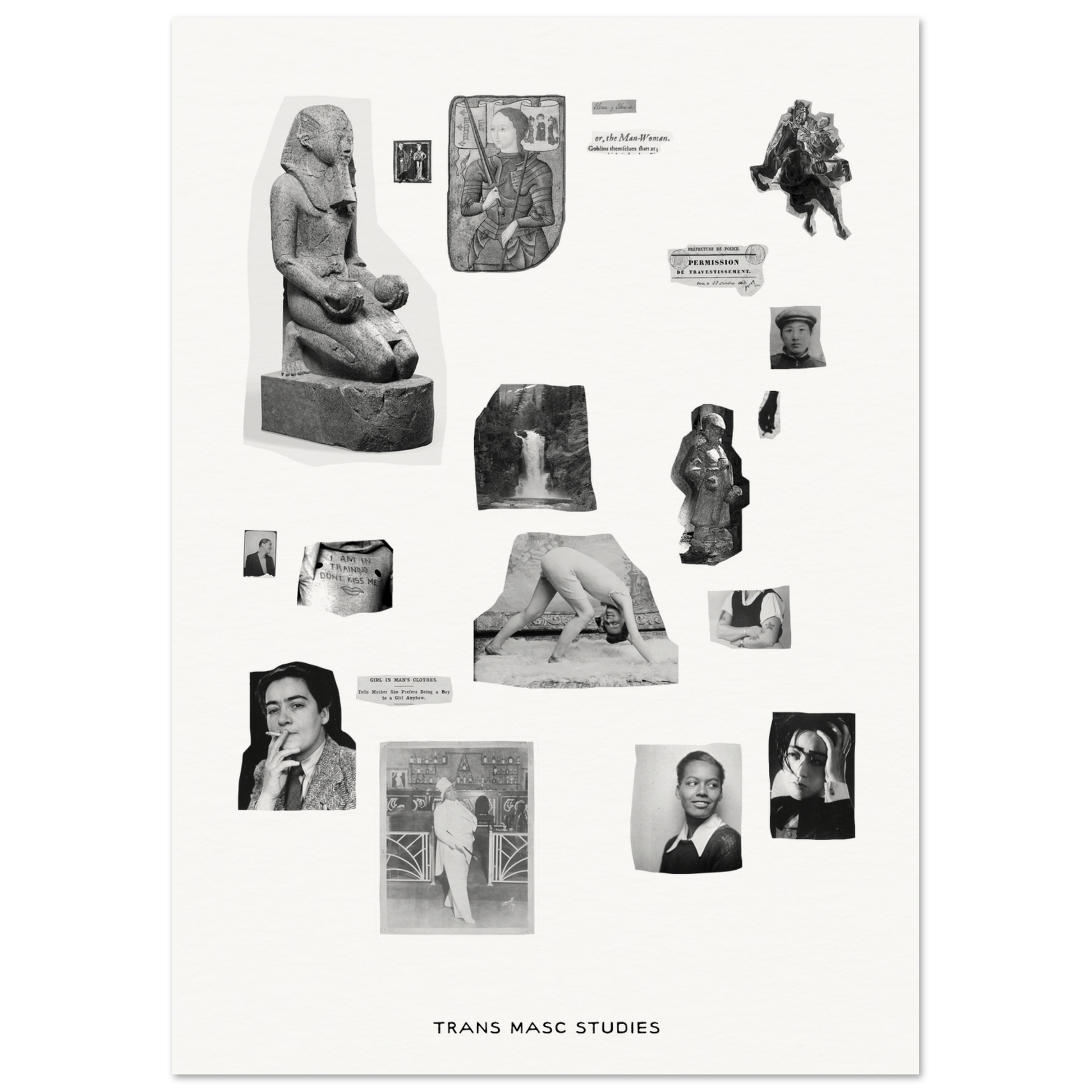 Celebrate trans masc history with this print depicting masculine leaning gender variant people from history, going as far back as 1507BC. This artwork includes images of trans masculine people and ephemera from their lives over millennia.