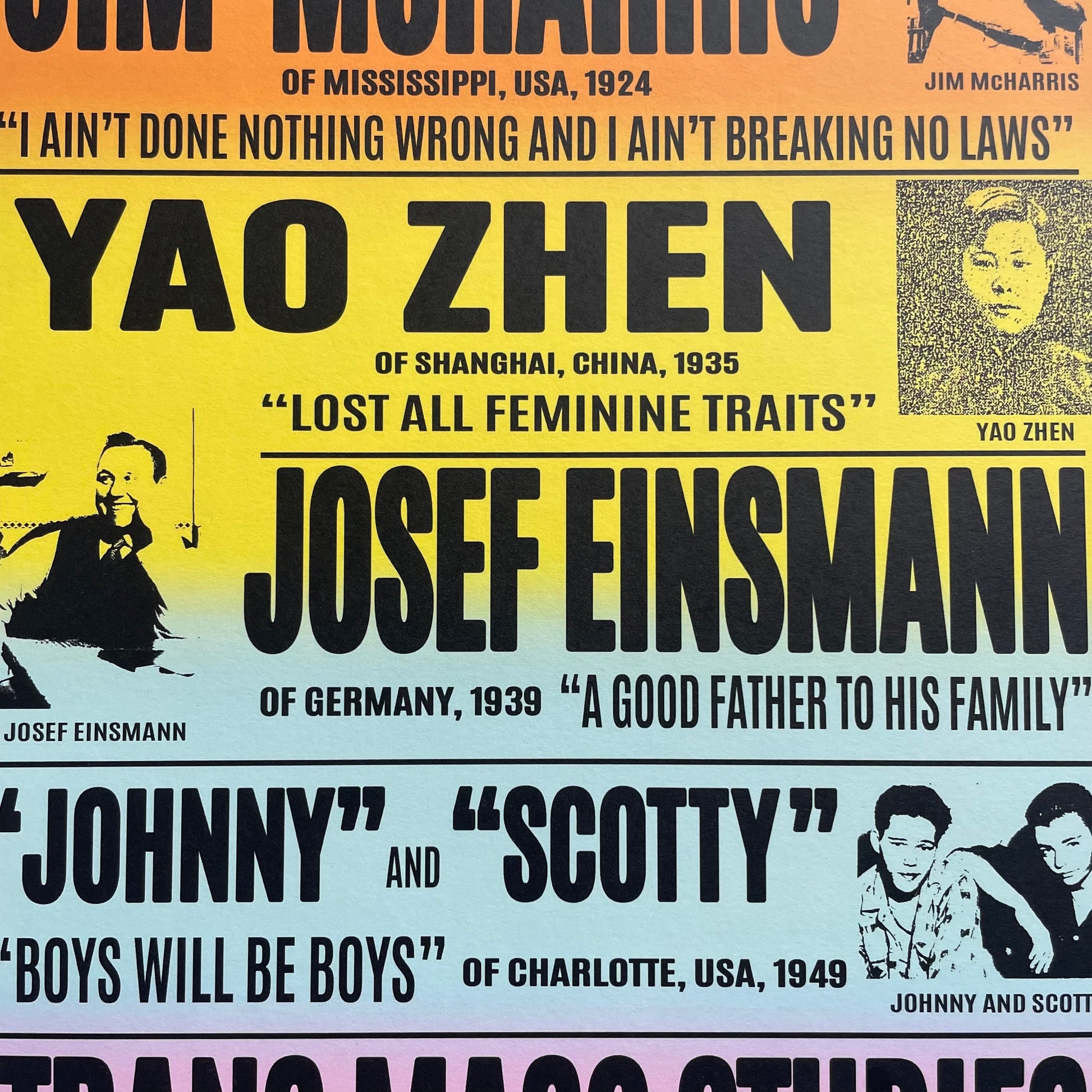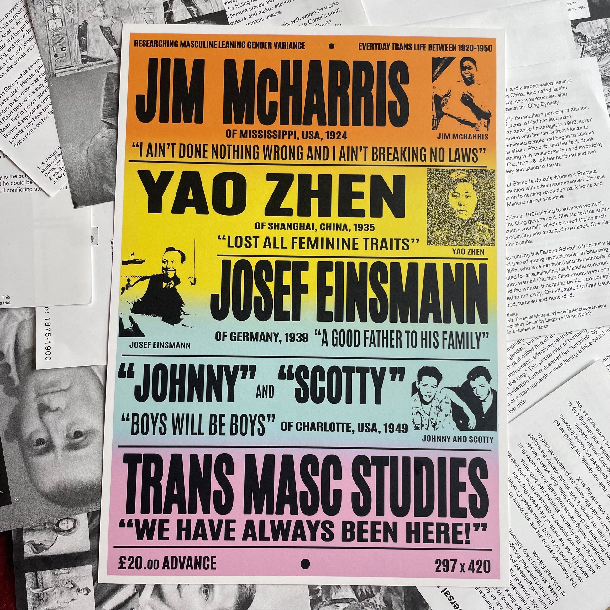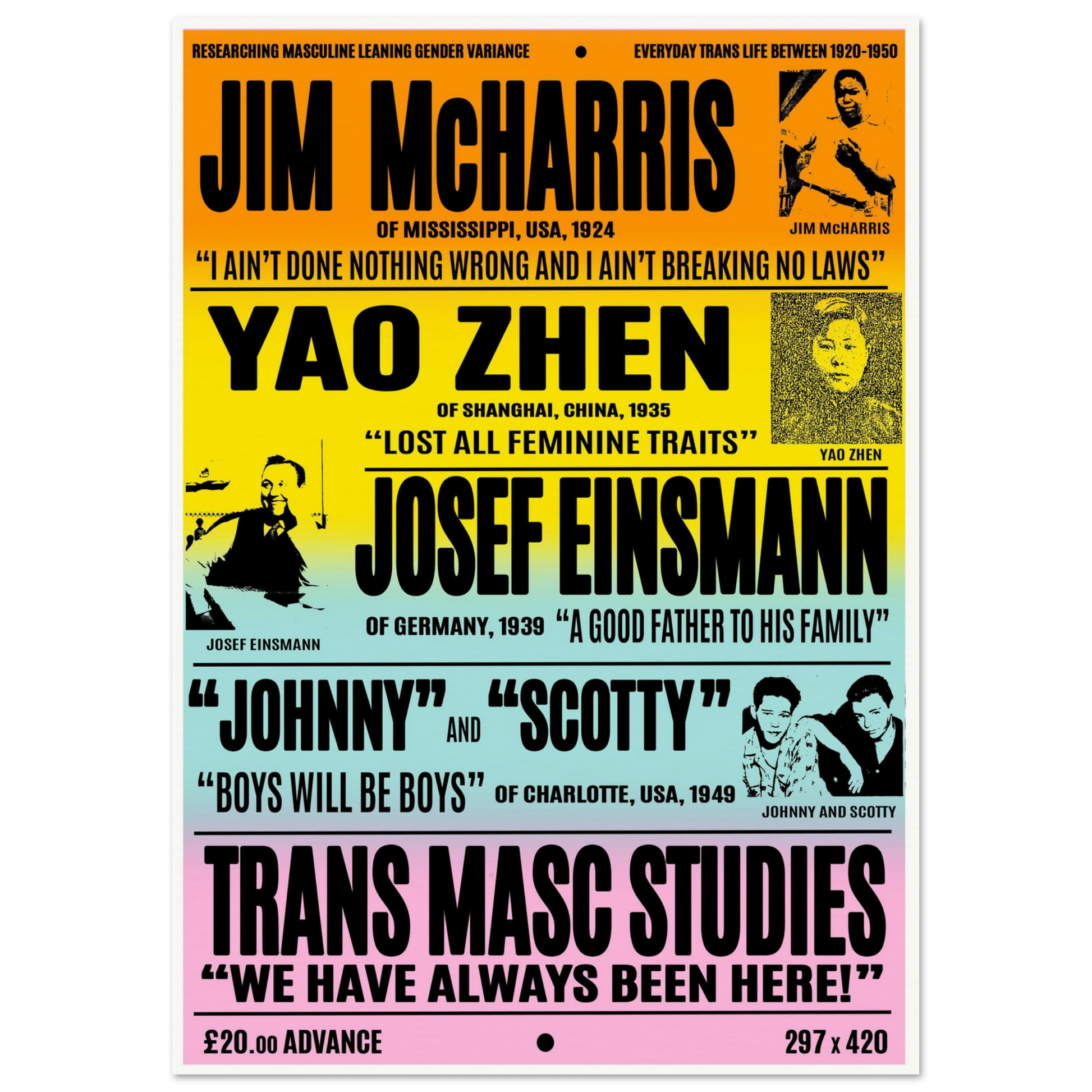 This poster is made of newspaper clippings reporting on masculine-leaning gender variant people between 1920-1950, created to celebrate trans people in history who weren't famous activists, rulers or celebrities, but who were normal people, living their lives and expressing themselves as they wanted to.