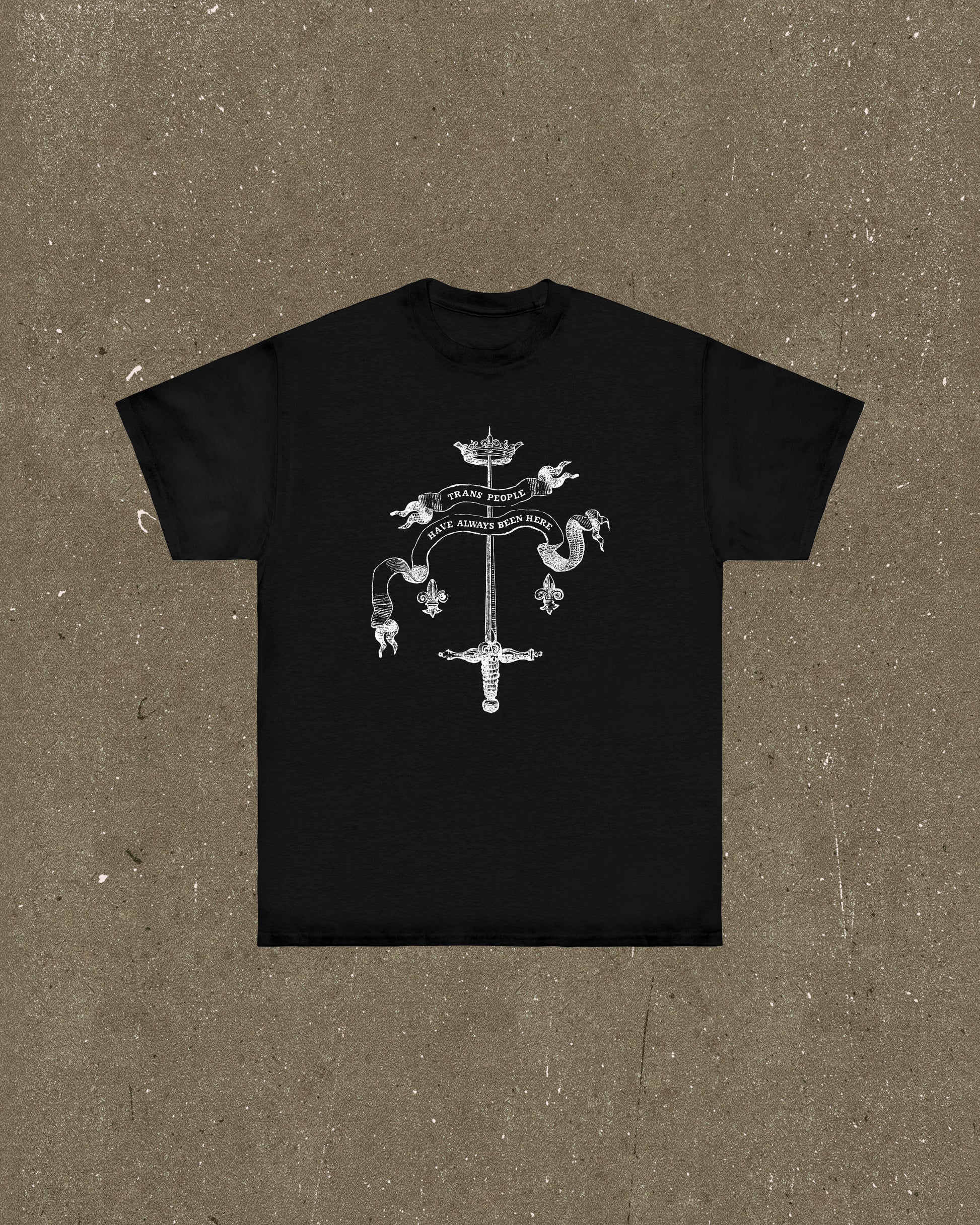 A design based on Joan of Arc's family crest, asserting the trans community's long-lasting history. The coat of arms depicts a sword, a crown and two fleurs-de-lis. ⚔️