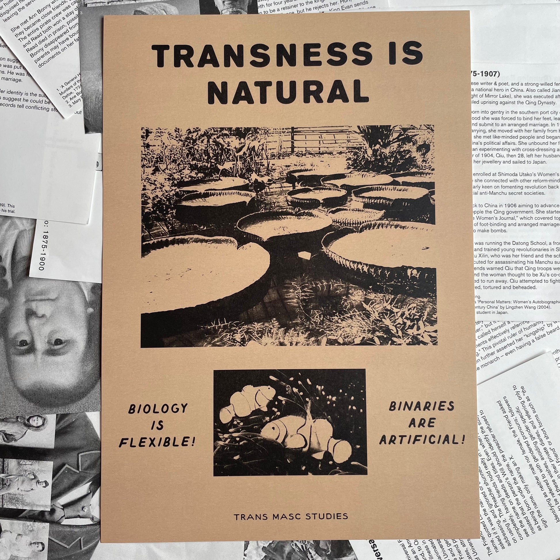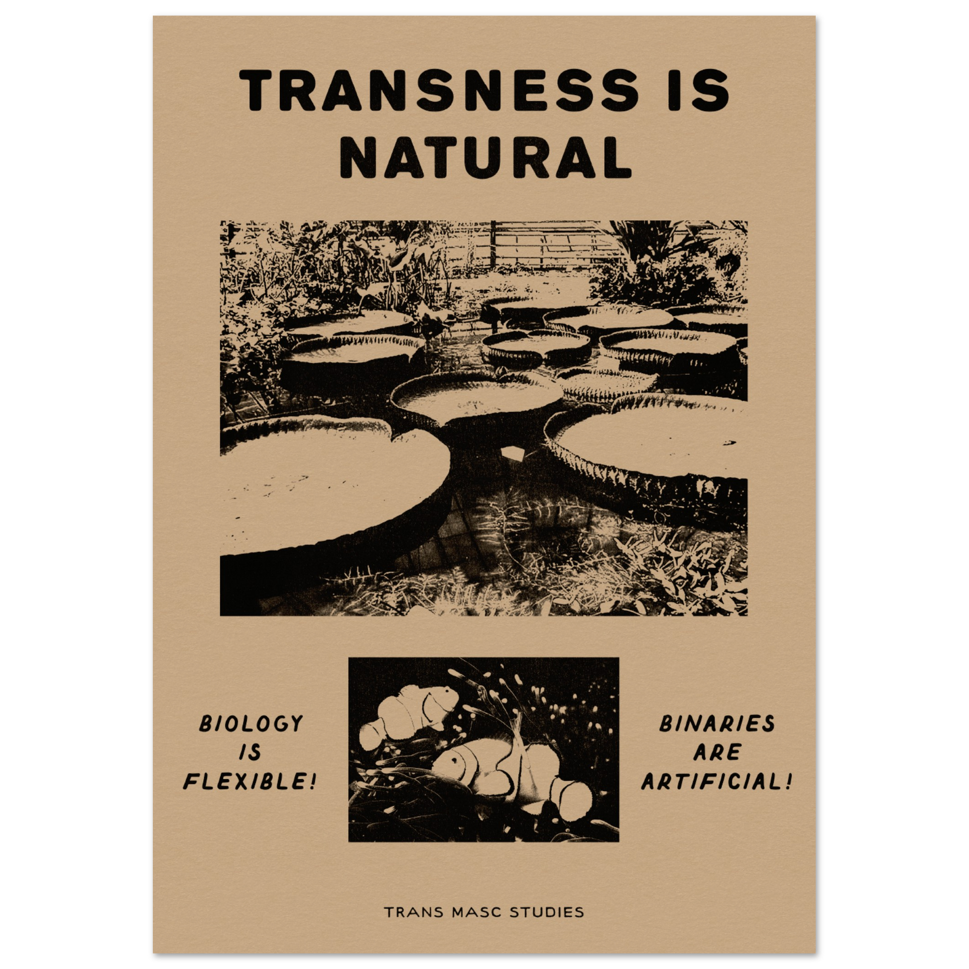 Among many many other species of flora and fauna, both the Victoria Amazonica plant and the clown fish can change from female to male. They exemplify nature's own understanding of the diversity and complexity of gender, and reinforce the message that transness is an inherent, authentic aspect of existence.