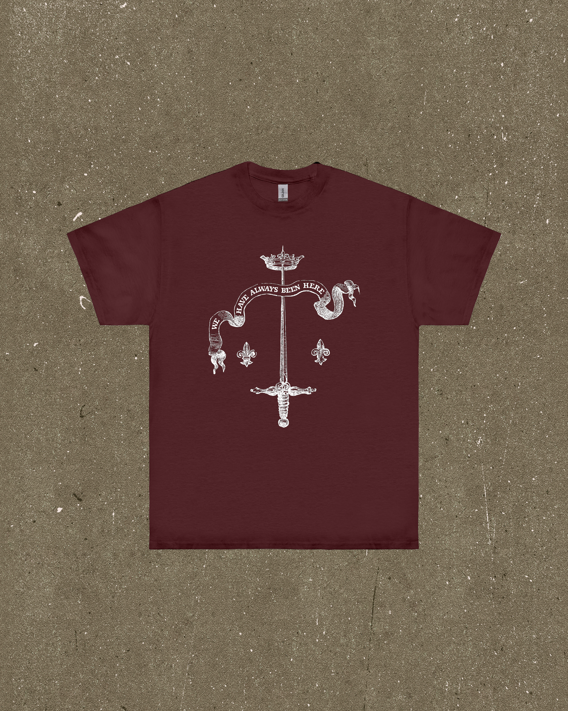 A design based on Joan of Arc's family crest, asserting the trans community's long-lasting history. The coat of arms depicts a sword, a crown and two fleurs-de-lis. ⚔️